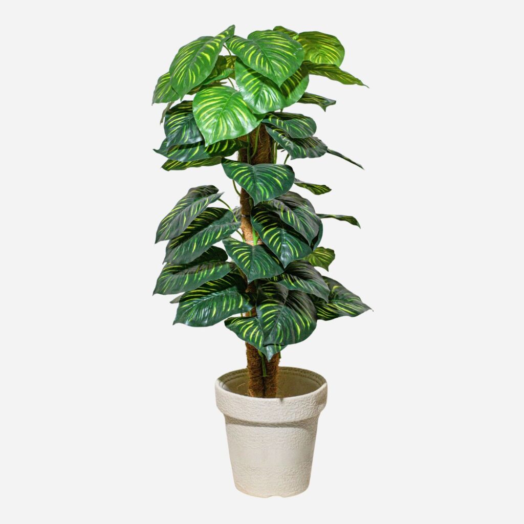 The plant features large tropical-style bail leaves with natural vein patterns, giving it a highly realistic and vibrant appearance. The rich green shades and carefully designed foliage mimic the look of real plants, making it an excellent decorative option for those who want greenery without the hassle of maintenance.