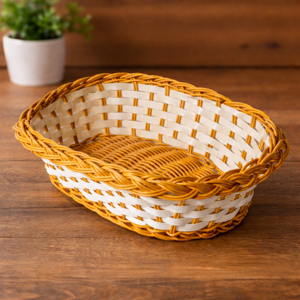 The Plastic Oval Cream Basket is a practical and aesthetically pleasing storage solution suitable for both home and commercial use. Designed with a classic woven pattern, it mimics the appearance of a traditional wicker basket while offering the durability and low maintenance of high-quality plastic.