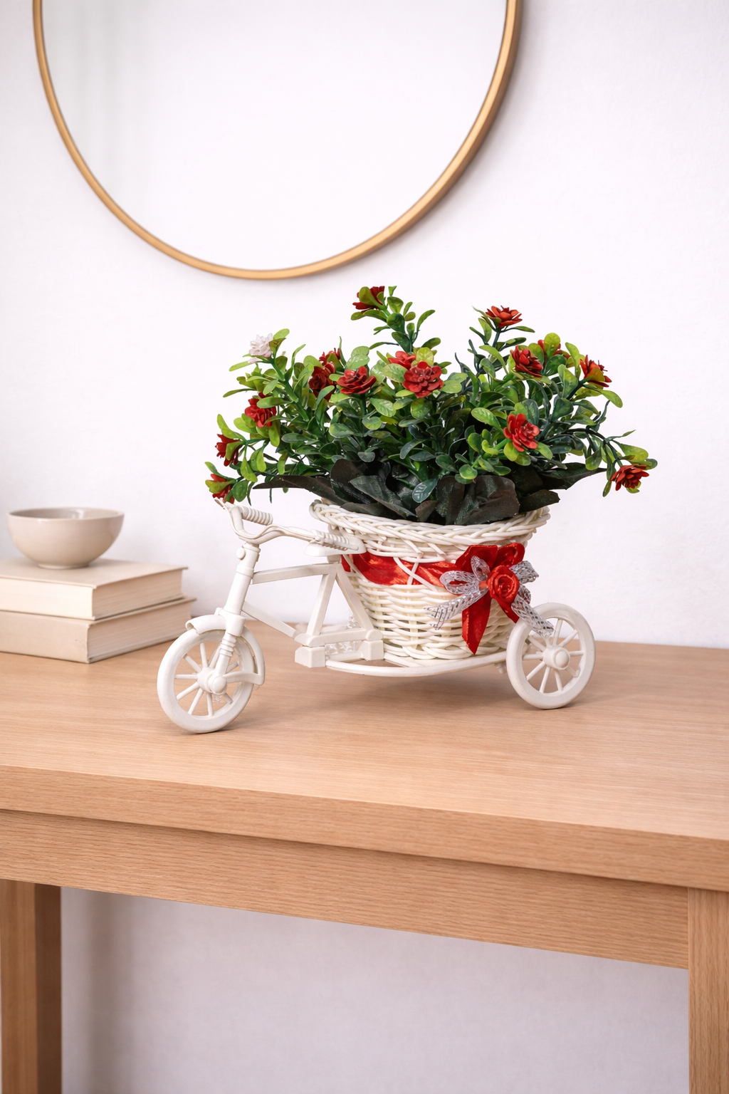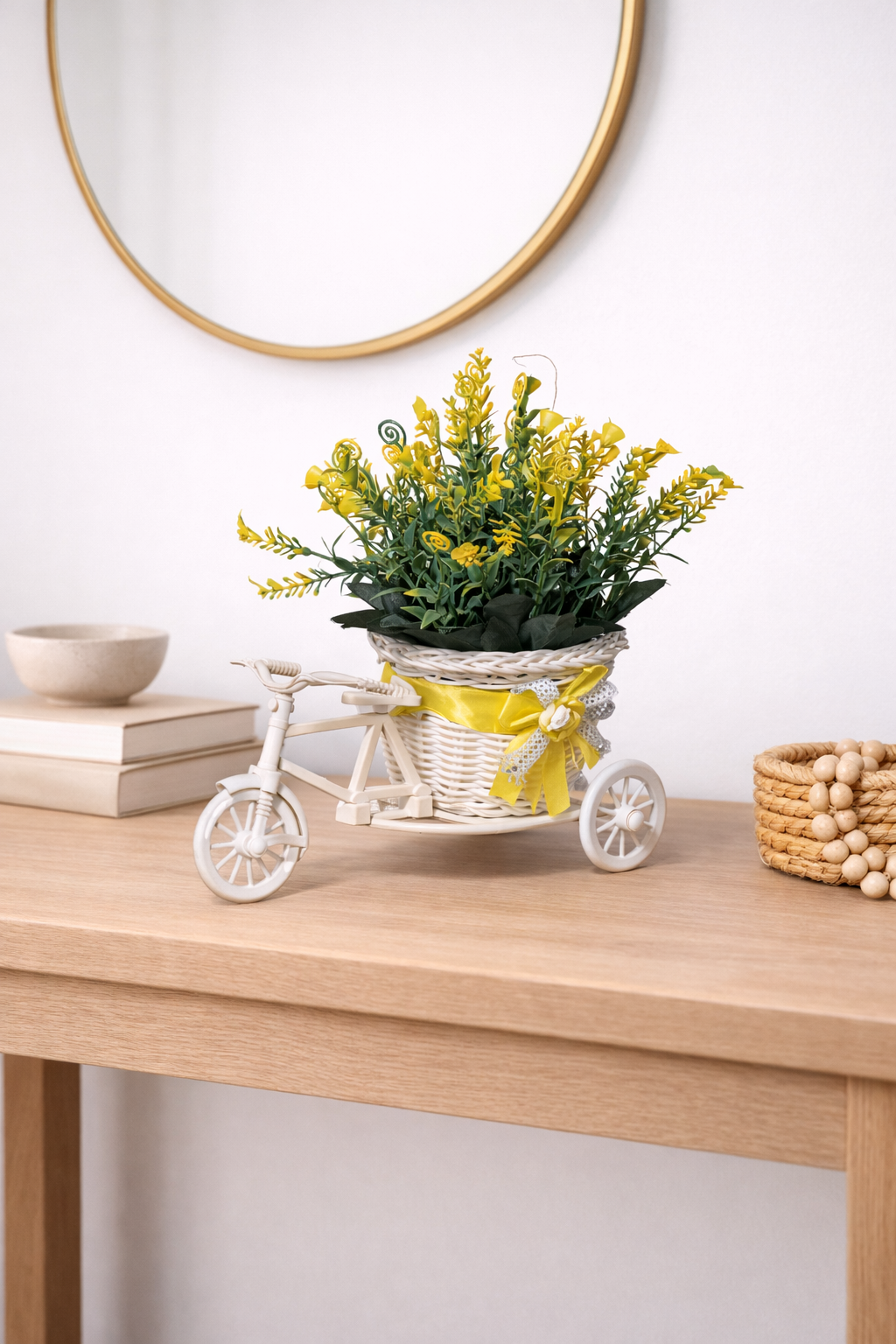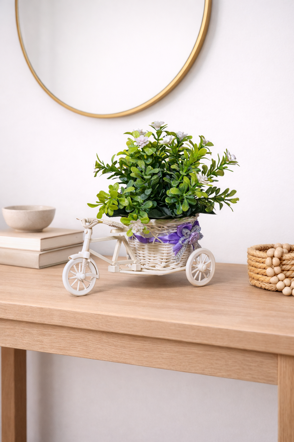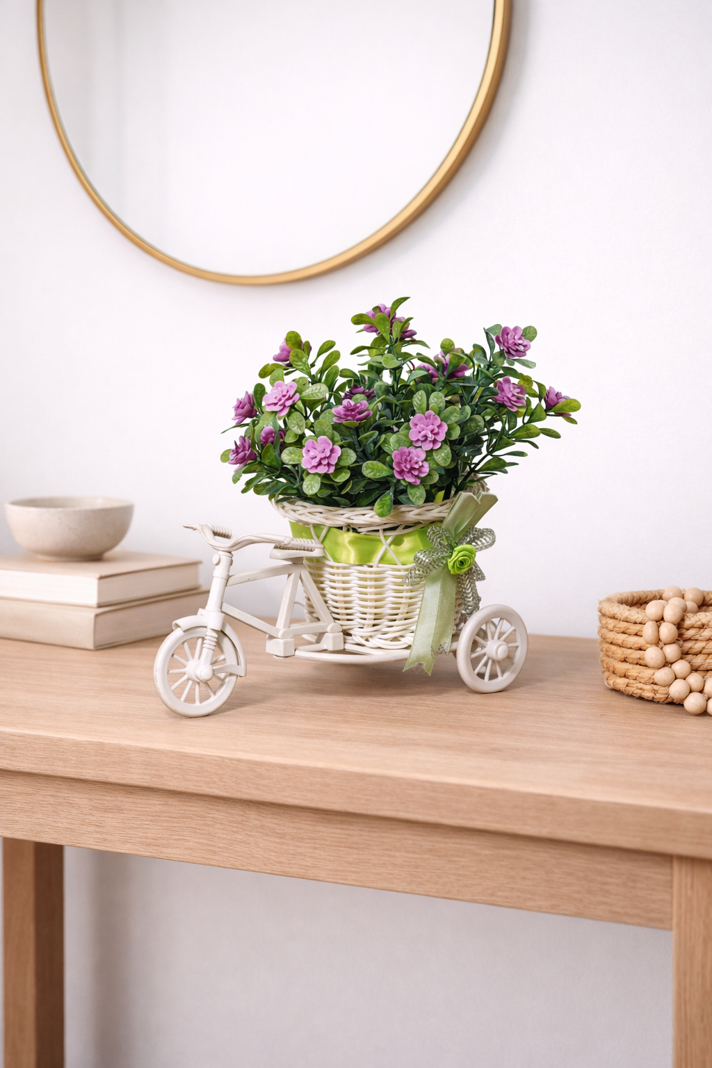 The Cycle Basket Bonzai is an elegant decorative showpiece designed to enhance interior spaces with a charming vintage aesthetic. It features a miniature cycle-style basket filled with artificial bonsai flowers, creating a visually appealing decorative accent for homes, offices, cafes, or gift arrangements.