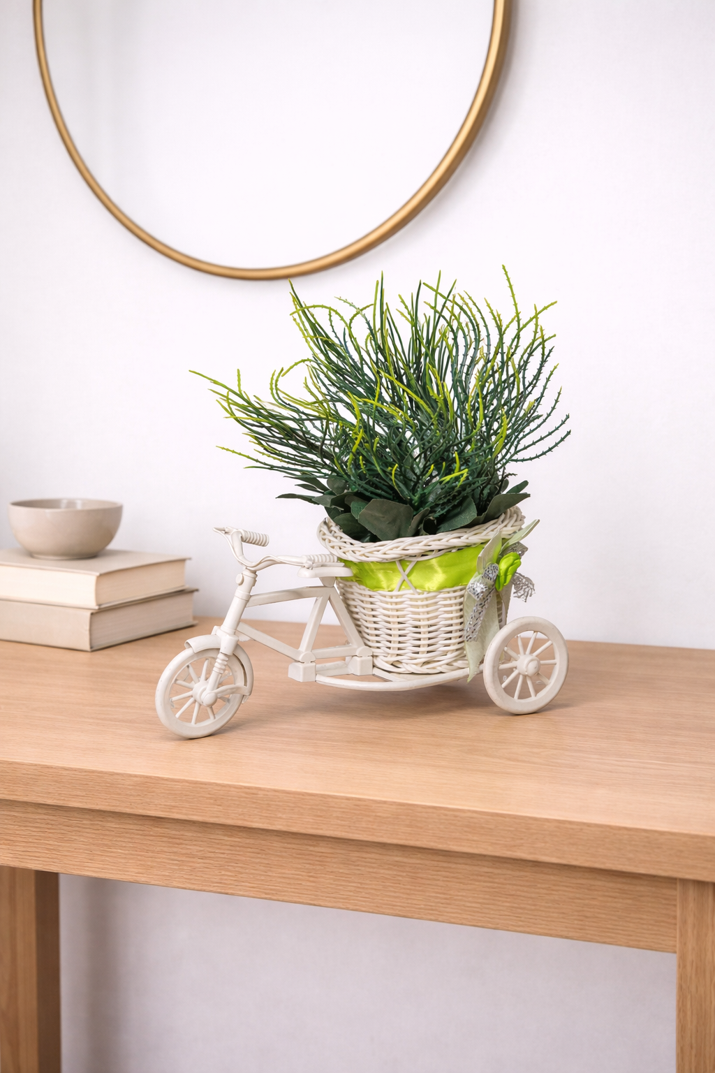 A creative bonsai arrangement presented in a decorative cycle basket base. This unique design blends greenery with rustic charm, making it a standout décor piece for living rooms, boutiques, or gifting occasions.