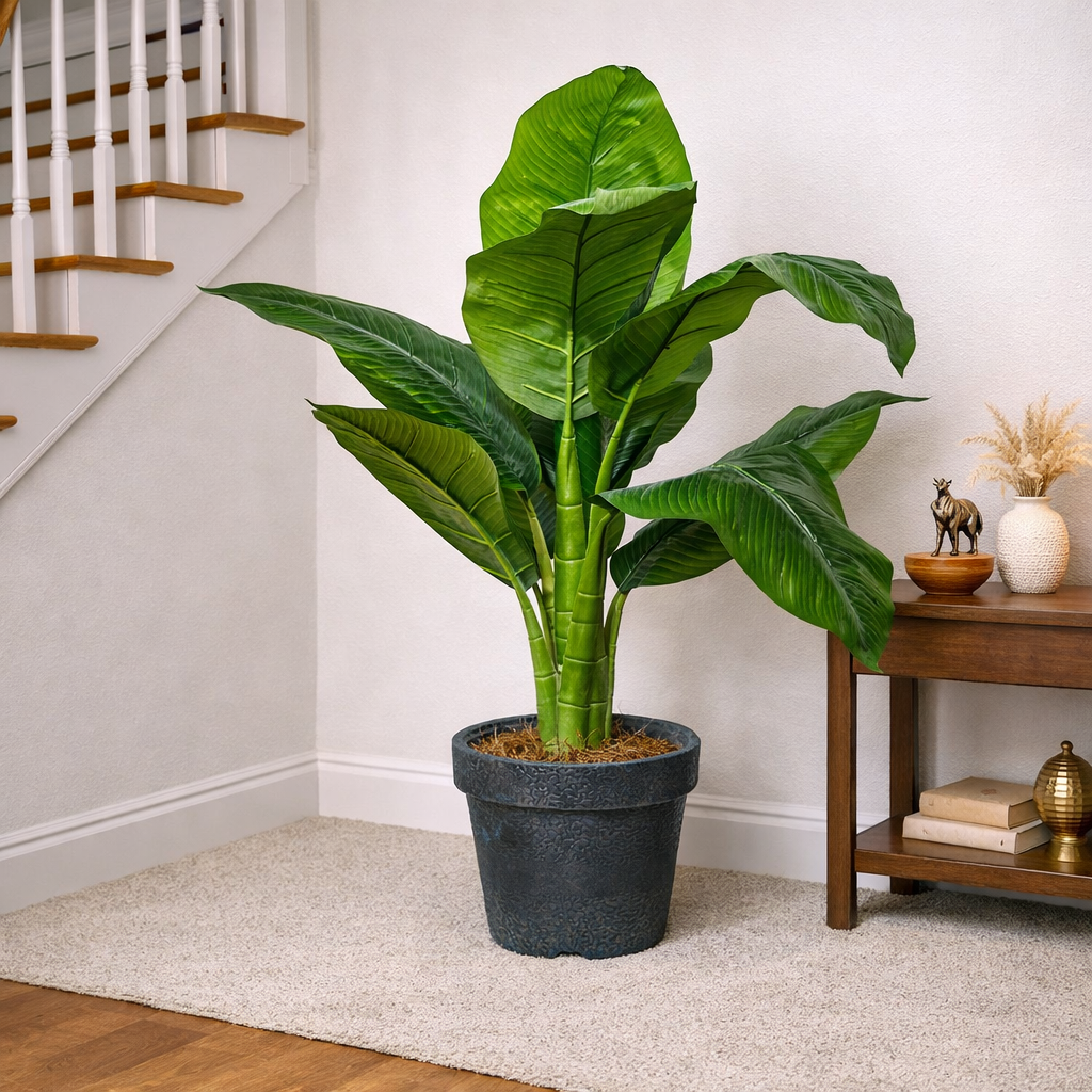 Standing at 30 inches tall, this decorative plant is ideal for tabletops, side tables, office desks, or floor décor in smaller spaces. The carefully designed leaves mimic the texture and appearance of real banana leaves, making the plant look incredibly realistic.